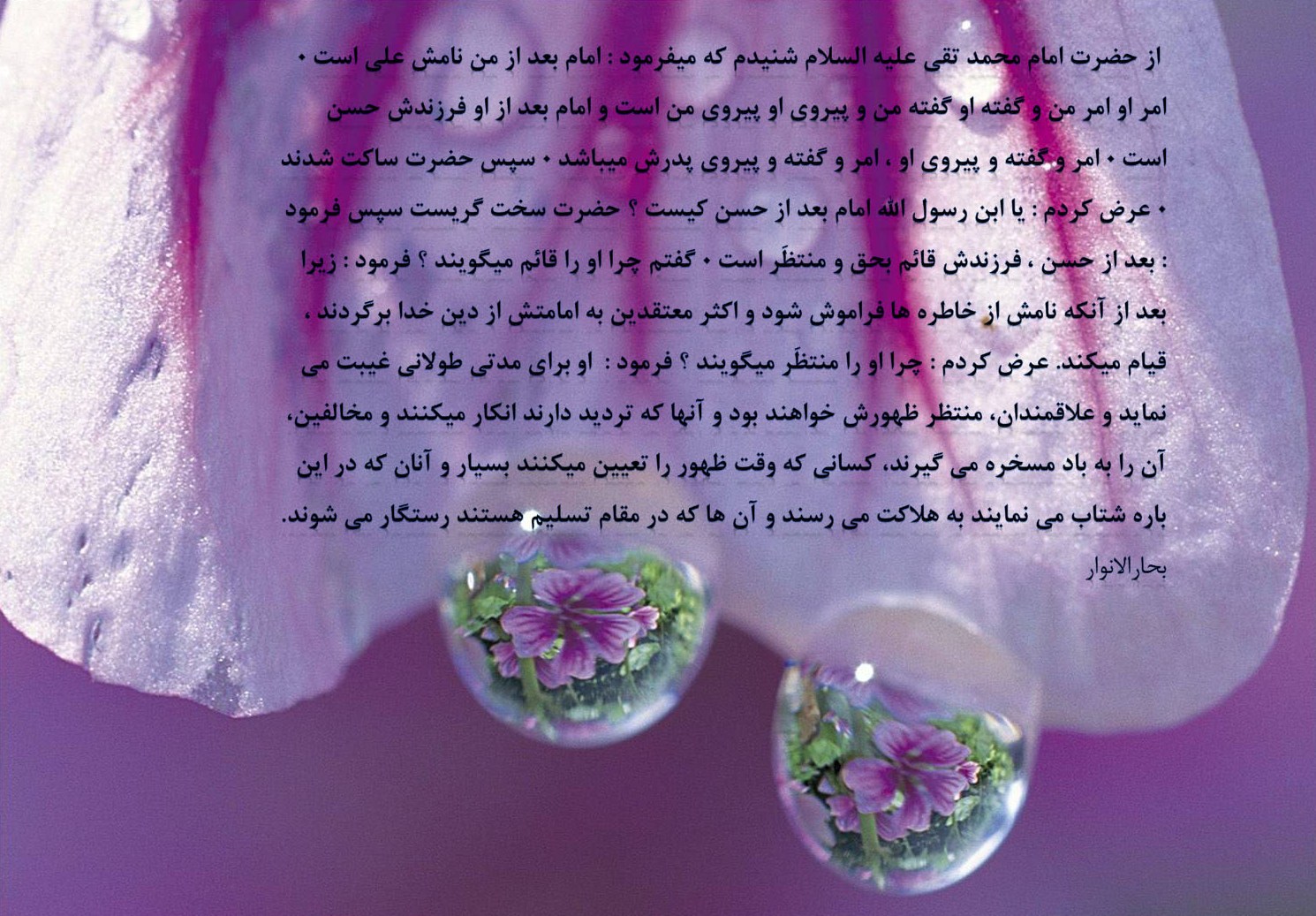 12. رسول خدا(صلی الله علیه و آله) دربارة مهدي موعود (ارواحنافداه) فرمود: «...مَهدِيُّ اُمَّتي أشبَهُ النَّاسِ بي في شَمائِلِهِ وَ أقوالِهِ وَ أفعالِهِ؛ مهدي امتم در شکل و شمايل و گفتار و رفتار شبيه ترين مردم به من است» علامه مجلسي، بحار الانوار، ج52، ص379.